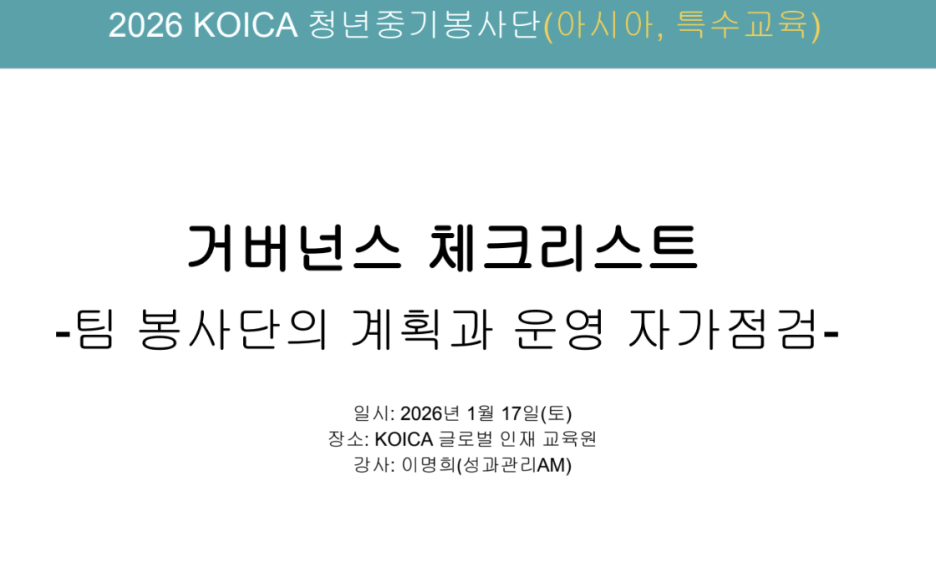 | [라오스 3팀] "거 해외봉사, 그냥 떠나는 거 아닙니다" – 2주간의 KOICA 청년중기봉사단 대면심화교육 기록! (1) | 2026.02.27 |